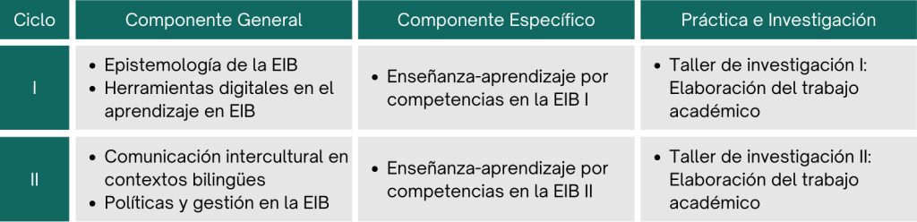 El programa tiene una duración de un año (dos ciclos), con una carga total de 32 créditos y 384 horas cronológicas.